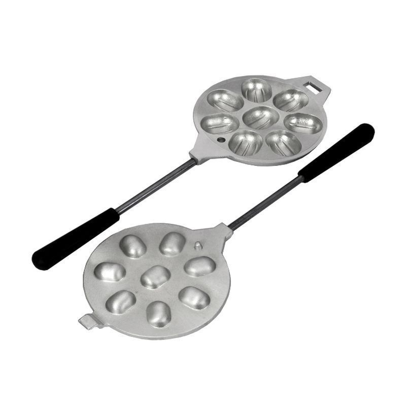 Форма для выпечки орешков изготавливается из пищевых алюминиевых сплавов методом кокильного литья. Это самый качественный и экологически чистый способ изготовления литой толстостенной посуды. Идеальное распределение тепла по всей поверхности посуды, разъемные половинки формы, тесто не прилипает к форме, отлично пропекается. Удобные ручки изготовлены из термостойкого материала, не нагреваются и не обжигают руки.