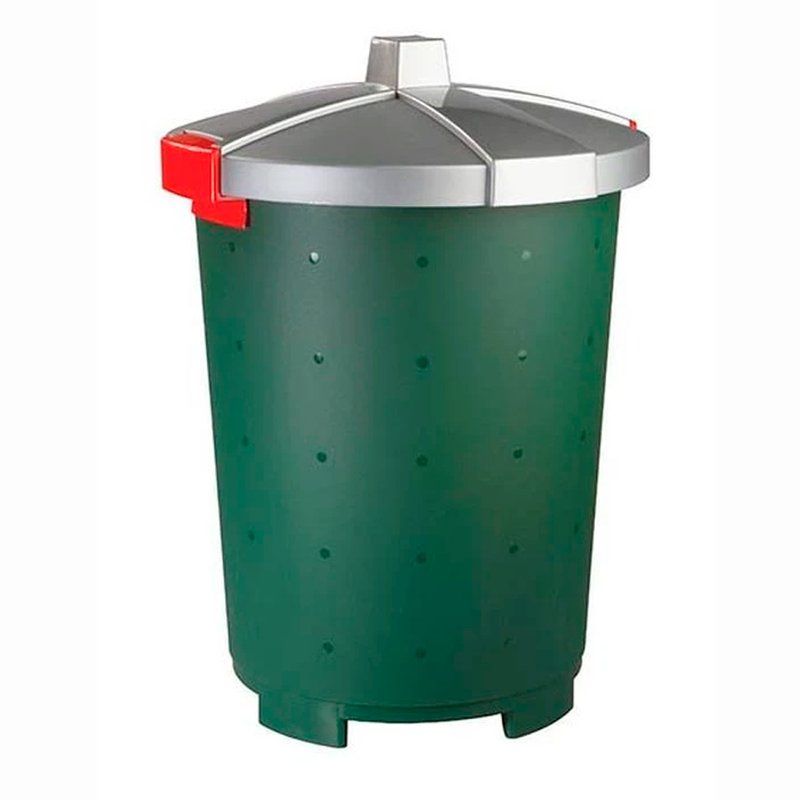 Прочный пластиковый бак объемом 65 литров может использоваться как в помещениях, так и на улице. Благодаря застежкам крышка надежно держится на изделии.