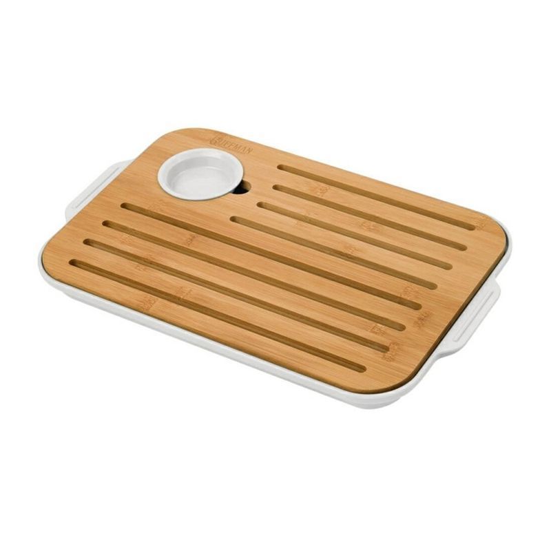 Доска изготовлена из экологически чистого бамбука с отверстиями, которые сделаны для того, чтобы при нарезке продуктов, крошки сыпались вниз на поднос. Поднос и круглая съемная емкость из пластика. Уникальность этой модели в том, что такая доска может использоваться также для эффектоной и оригинальной подачи закуски: например, на доске можно красиво разложить сыр и хлеб, а в емкость налить мед или соус. Изделие легко моется водой с мылом. Не содержит бисфенол А и фталаты.