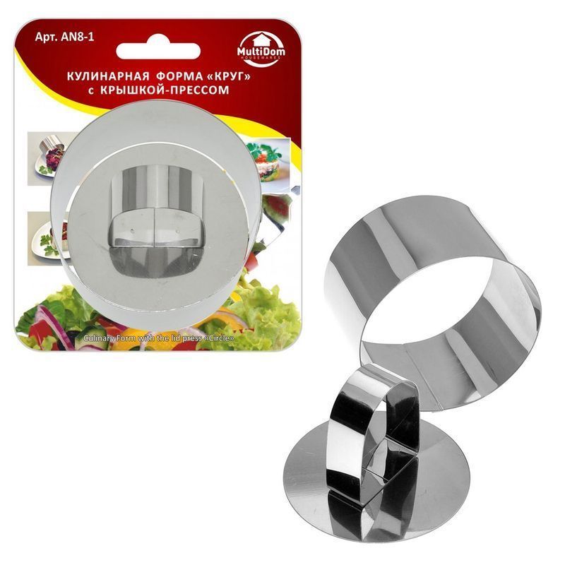 Чтобы аккуратно выложить слоеные салаты на тарелки или оформить десерты, используйте круглые кулинарные формы. Приспособление позволяет выровнять края и сделать блюдо идеально ровным. Используйте форму для салатов, выкладки порционных блюд, порционного тушения, сборки бутербродов, жарки омлета и т.д. Также формочки станут идеальными инструментами для приготовления десертов и пирожных. Диаметр изделия 7 см, высота 5 см, в комплект входит крышка, которая придает форму продуктам или помогает выталкивать готовое блюдо. Приспособление изготовлено из коррозионностойкой (нержавеющей) стали. После применения промывается губкой с использованием жидких моющих средств. Храните изделие в сухом помещении.