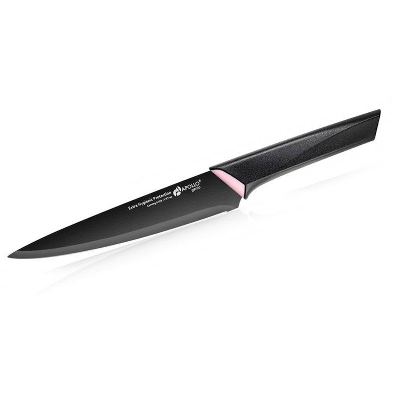 Нож предназначен для чистки овощей- фруктов и нарезки продуктов. Лезвие ножа имеет стойкое покрытие, которое уменьшает контакт продуктов со сталью, предотвращая процесс окисления и помогая сохранить полезные свойства продуктов. Специальная форма рукоятки не позволяет ножу выскальзывать из руки во время использования.