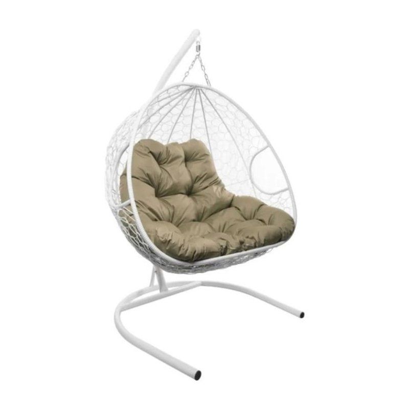Кресло подвесное Для двоих 120*125*190см металл с ротангом белое бежевая подушка (max нагр. 160кг)