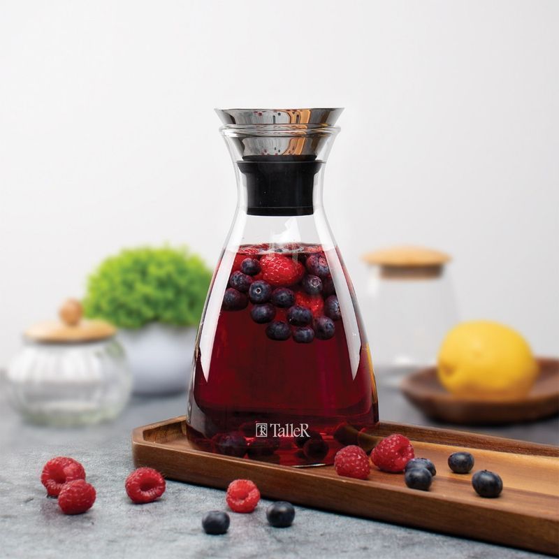 Кувшин из термостойкого боросиликатного стекла на 1200 мл. Крышка выполнена или пищевого силикона и нержавеющей стали 18-10. Удобное сливное горлышко, двухуровневая фильтрация, надёжная фикция крышки. Разборная конструкция крышки позволяет легко промывать фильтр. В кувшине удобно приготовить лимонад с добавлением ягод, фруктов и трав, холодный чай со льдом или просто воду с лимоном.