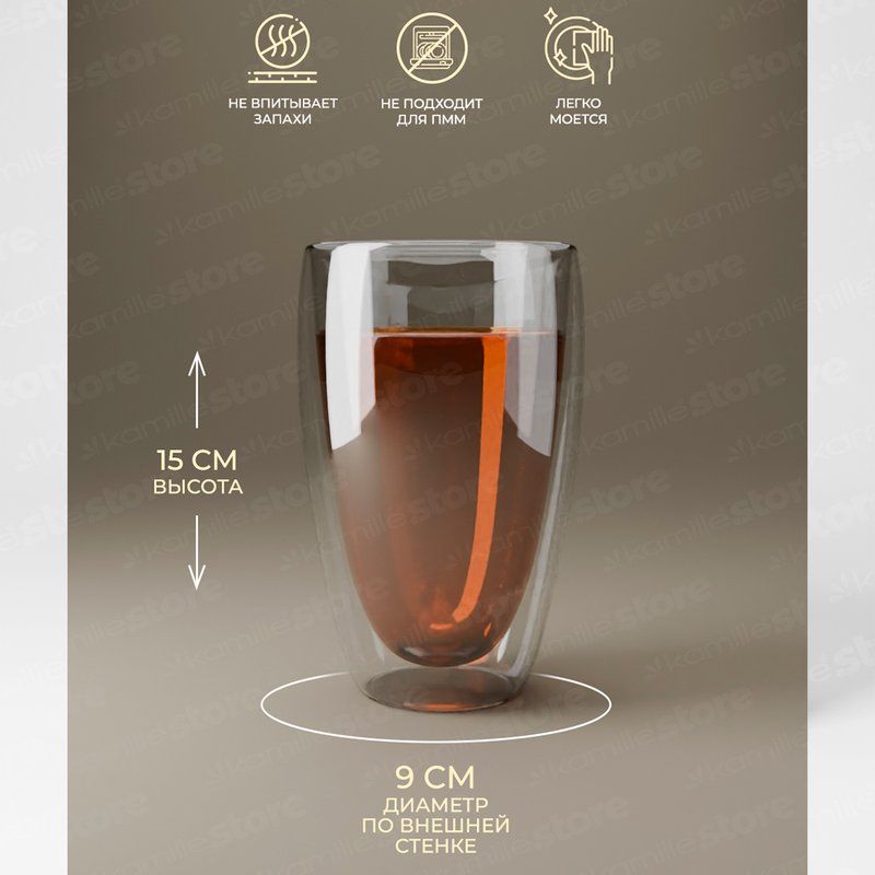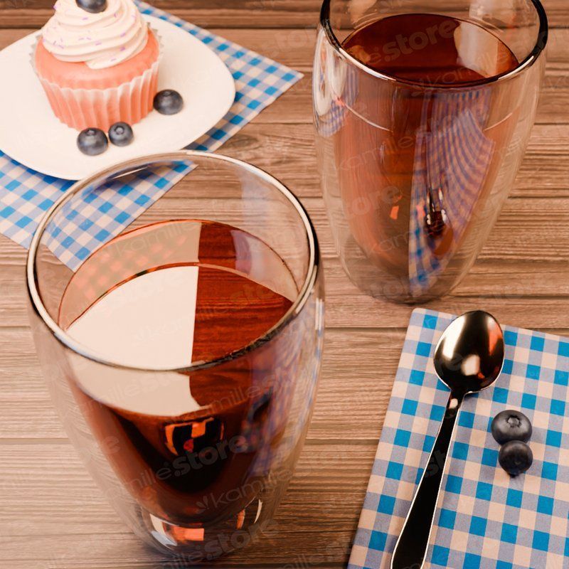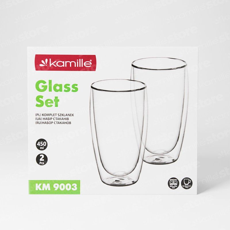 Стаканы с двойными стенками из стекла Kamille – изящные и легкие. Корпус полностью изготовлен из боросиликатного стекла, что дает повышенную термостойкость и механическую прочность, материал безопасен для здоровья, красив и надежен. По сути, это две чаши одинаковой формы, но разного размера, вставленные одна в другую и соединенные по верхнему краю. С виду кажется, что внутренняя часть как будто парит над столом, а вместе с ней напиток. Это красиво и необычно. Используется как дизайнерский прием в сервировке праздничного стола, в кафе и ресторанах, и благодаря оригинальному внешнему виду посуда с двойными стенками станет отличным подарком для любого повода.