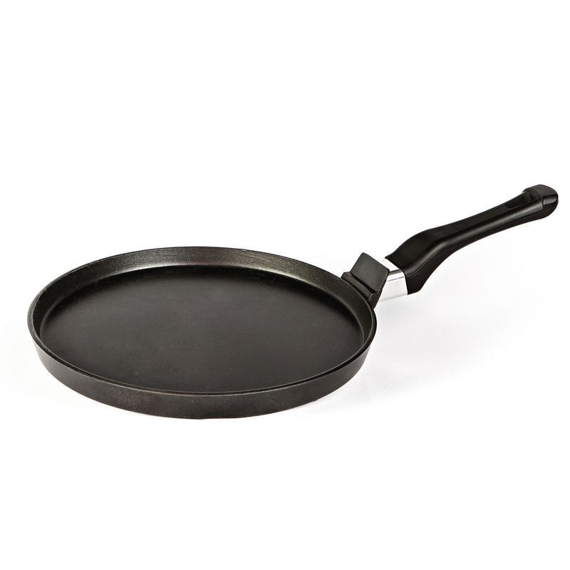 Сковорода блинная: с пластиковой несьемной ручкой, утолщенным дном и антипригарным покрытием "Ладофлон".