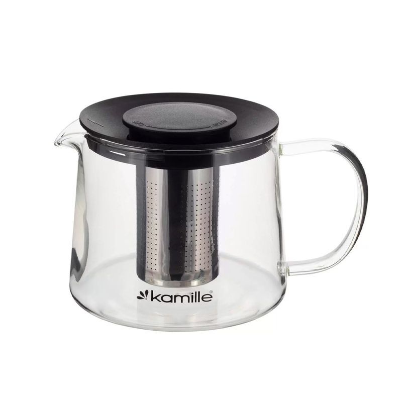 Стеклянный чайник с ситечком для заваривания чая. Материал чайника: термостойкое боросиликатное стекло. Материал крышки - пластик; ручка - стекло. Материал ситечка: нержавеющая сталь.