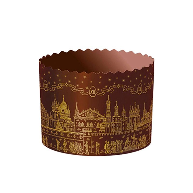 Пасхальные бумажные формы для выпечки куличей. Формы выполнены из бумаги коричневого цвета с золотой печатью, с изображением храма.