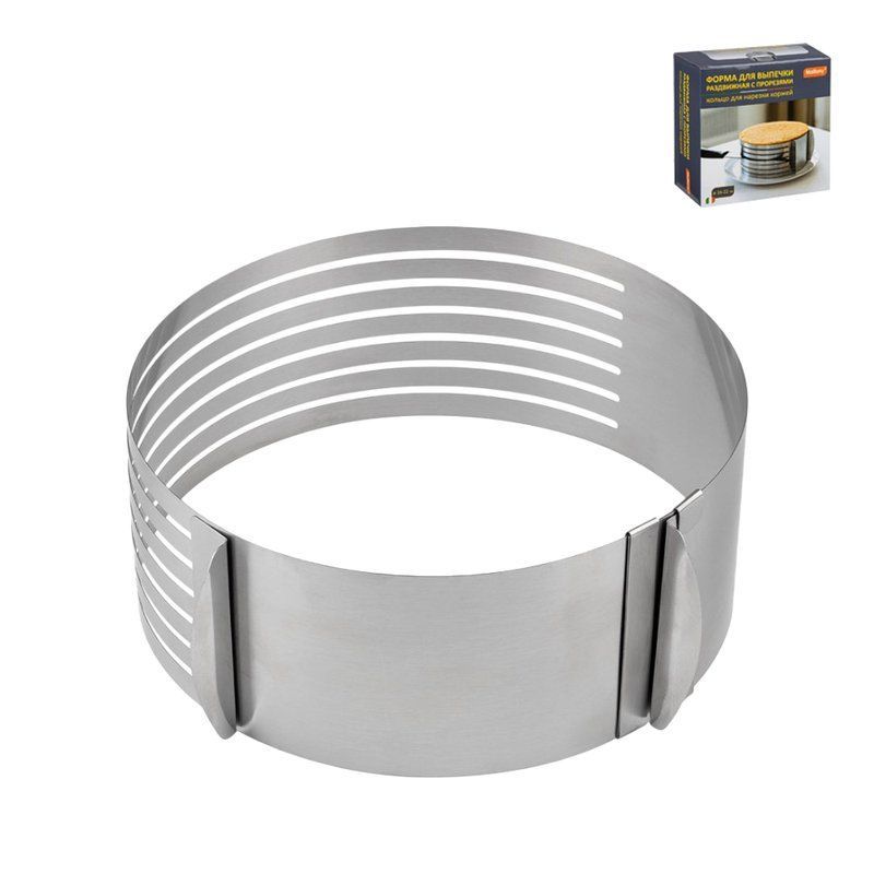 Высота борта: 8 см Размер : 16-22 см Толщина стали: 0,35 мм Материал: нержавеющая сталь (430) Упаковка: цветная коробка Развижная форма для выпечки с прорезями используется для выпекания и нарезки бисквита для коржей. С ее помощью можно приготовить бисквит диаметром от 16 до 22 см и нарезать коржи высотой 8-10 мм (до 7 штук). Форма полностью разъемная, что позволяет аккуратно убрать ее после нарезки, не повредив коржи. Форма изготовлена из высококачественной нержавеющей стали. Материал не токсичен, не впитывает запахи, устойчив к высоким и низким температурам, подходит для мытья в посудомоечной машине. Рекомендации по использованию: - Перед первым применением рекомендуется помыть форму в теплой воде мягкой губкой с использованием моющего средства. - Перед нарезкой бисквит рекомендуется полностью остудить. - Лезвие ножа должно быть длиннее диаметра формы. - Сначала бисквит через прорези нарезается до середины с одной стороны, затем форму нужно повернуть и нарезать с другой стороны.