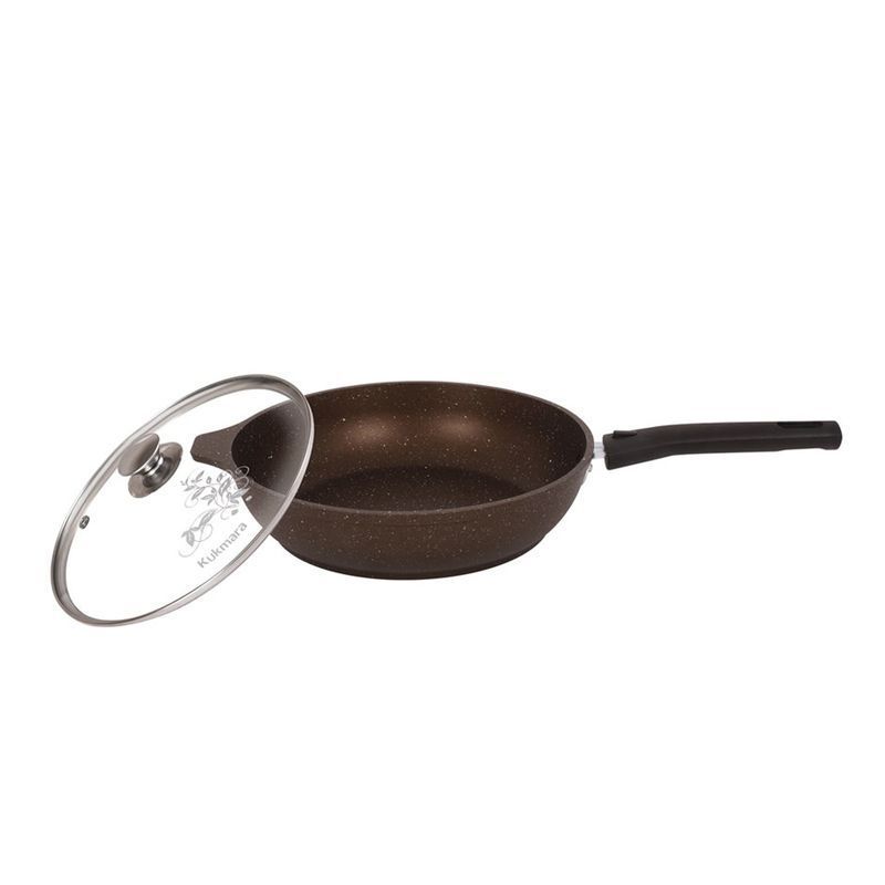 Сковорода "Kukmara" изготовлена из литого алюминия и покрыта инновационным антипригарным мраморным покрытием нового поколения на водной основе, усиленным сверхтвердыми частицами минералов.