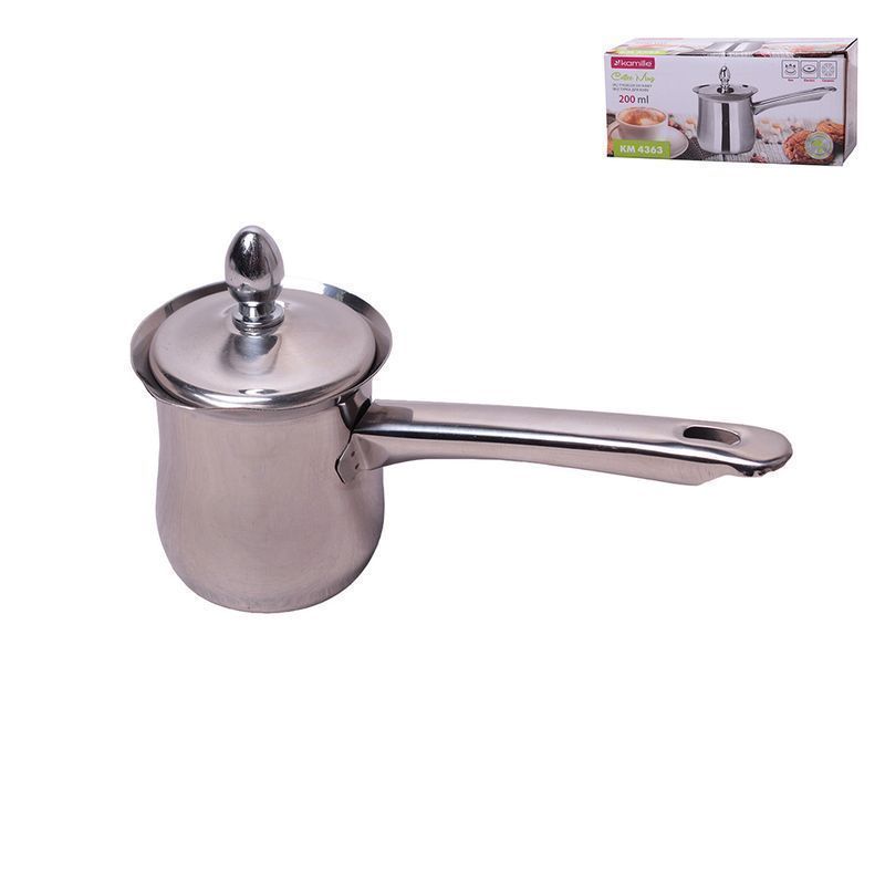 Турка для кофе с крышкой. Материал: нержавеющая сталь. Материал ручки: нержавеющая сталь. Объем: 200 мл. Диаметр: 7,4 см; (8,3 см. с лейкой). Высота 7,8 см. Длина (с ручкой) 19 см. Используется для приготовления кофе по-восточному. Полировка металла: зеркальная-сатин. Тип плиты: электрическая, керамическая, газовая.