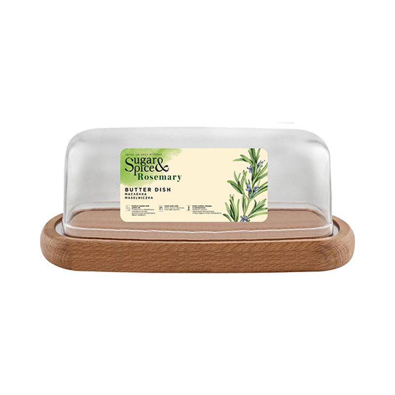 Масленка Sugar&Spice Rosemary предназначена для хранения сливочного масла в холодильнике и подачи на стол. Основание масленки изготовлено из дерева пароды бук. Деревянная поверхность покрыта маслом пригодным для пищи, что снижает риск проникновения запахов внутри древесины и продлевает срок службы. Прозрачная крышка позволяет видеть содержимое. Чтобы масленка сохраняла свои качества, ее не рекомендуется мыть в посудомоечной машине; нельзя греть в микроволновой печи, замачивать на длительное время в воде. Необходимо мыть тёплой водой с мыльным раствором; после мытья тщательно просушить. Каждые 2-3 месяца, доску необходимо покрывать пищевым маслом.