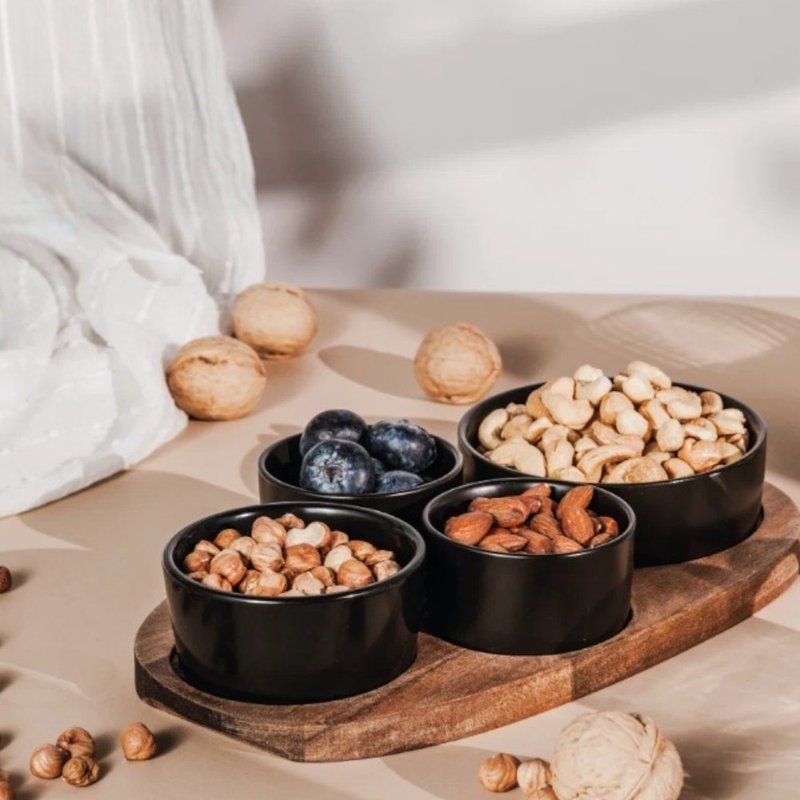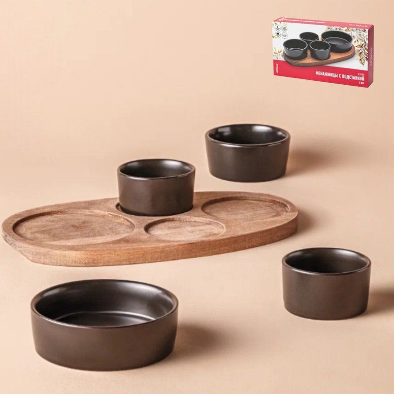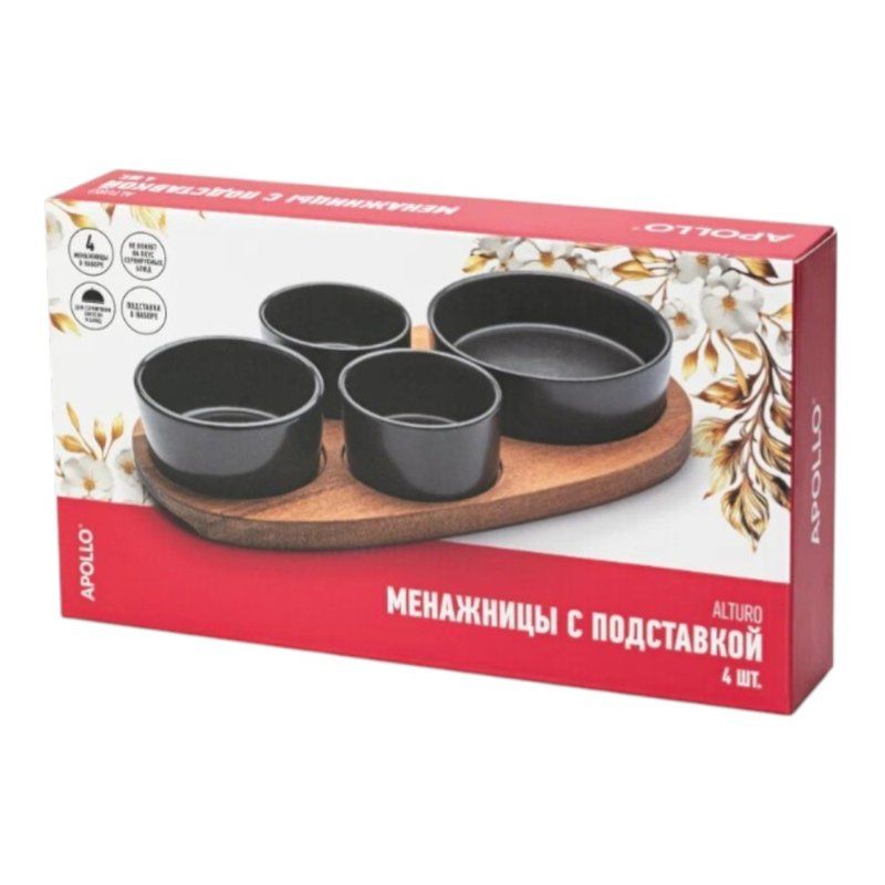 Менажница APOLLO Alturo — идеальное решение для сервировки стола! В комплект входят четыре керамических блюда объёмом 90 мл, 90 мл, 135 мл и 200 мл, а также стильная подставка из натуральной акации размером 28x16x1,5 см.