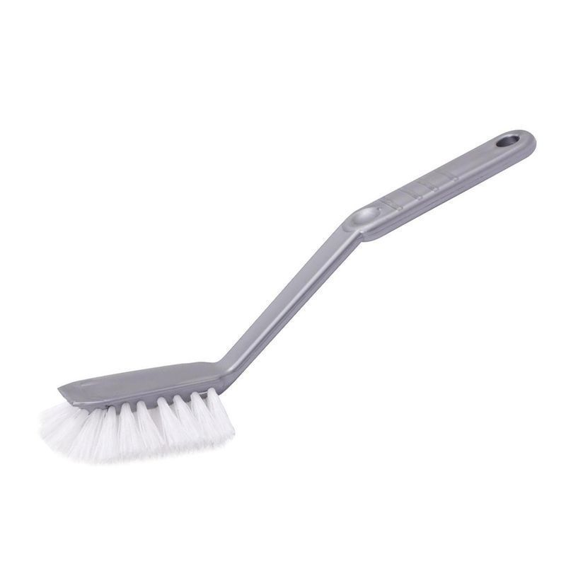 Щетка для мытья посуды, благодаря особому расположению щетины, идеально подходит для мытья сковородок и кастрюль. Удобная эргономическая ручка имеет отверстие для размещения на крючке. Ворс щетки прочный и не деформируется при высоких температурах воды.Длина щетины 2см